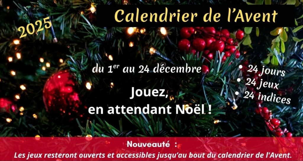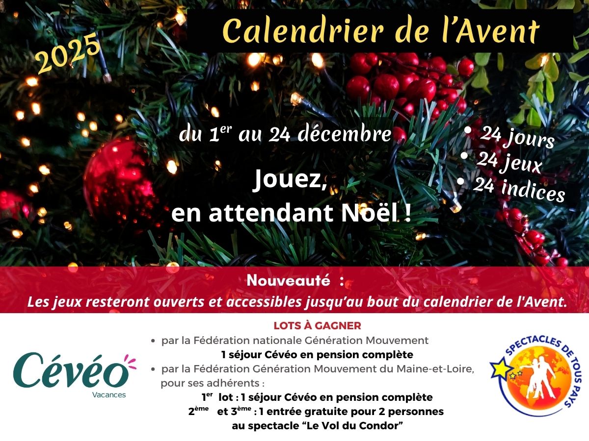 Tenez-vous prêt… Le calendrier de l’Avent arrive !fede49@gmouv.org26 novembre 2025 24 jours 24 jeux 24 indices Jouez chaque jour, du 1er au...Lire la suite