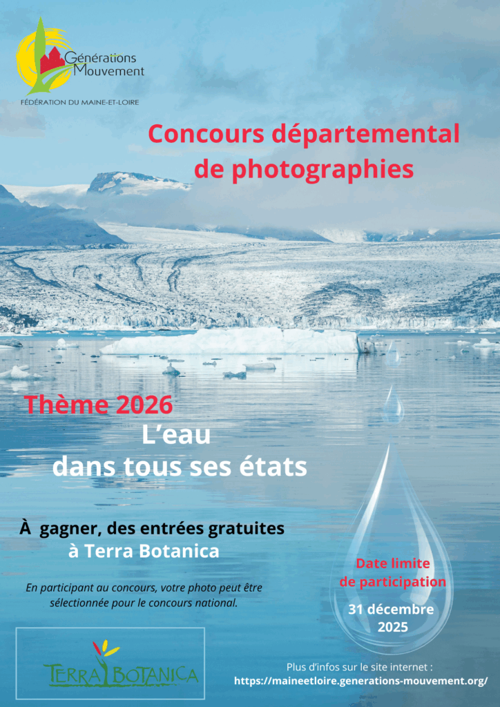 Envoi de votre photo à la Fédération Générations Mouvement de Maine-et-Loire. Votre cliché ne sera retenu que si vous êtes l’auteur la photo.